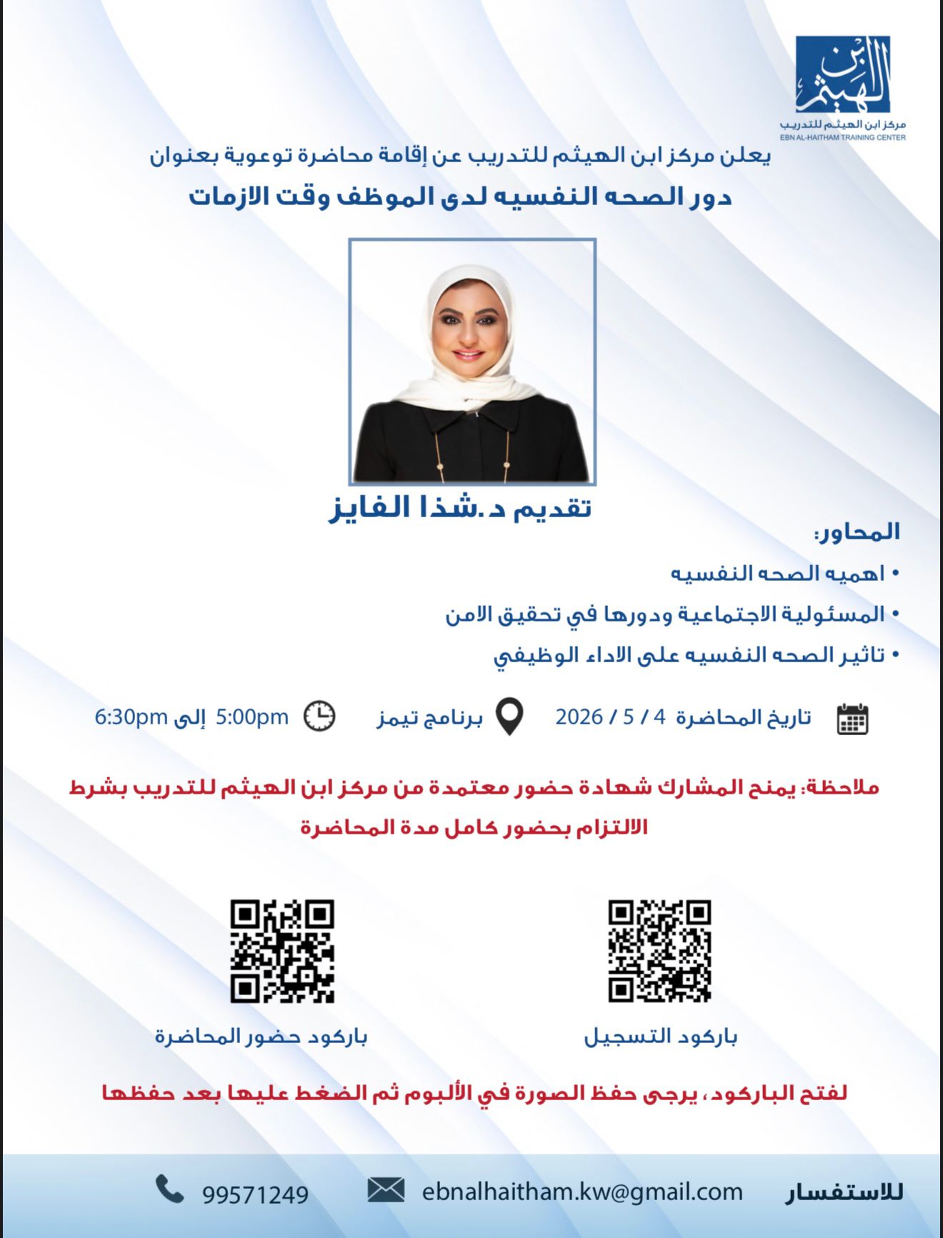 محاضرة توعوية بـــعنوان دور الصحه النفسية لدى الموظف وقت الازمات تقديم د. شذا الفايز |